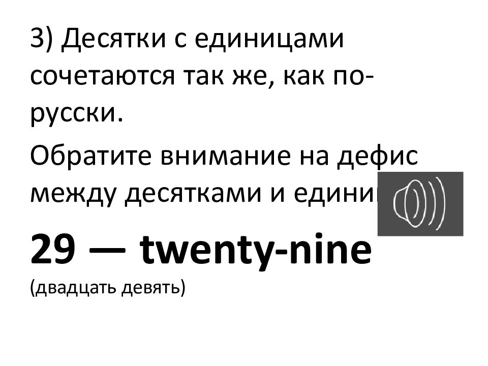 3) Десятки с единицами сочетаются так же, как по-русски. Обратите внимание на дефис между десятками и единицами. 29 — twenty-nine (двадцать девять)