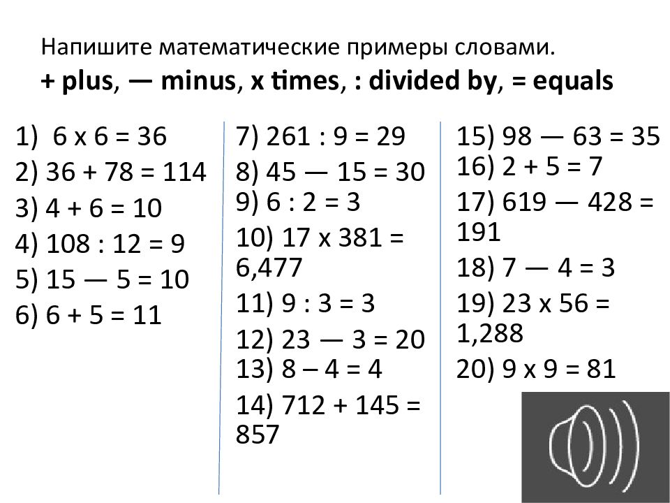 Слайд 25: Напишите математические примеры словами. + plus, — minus, х times, : divided by, = equals