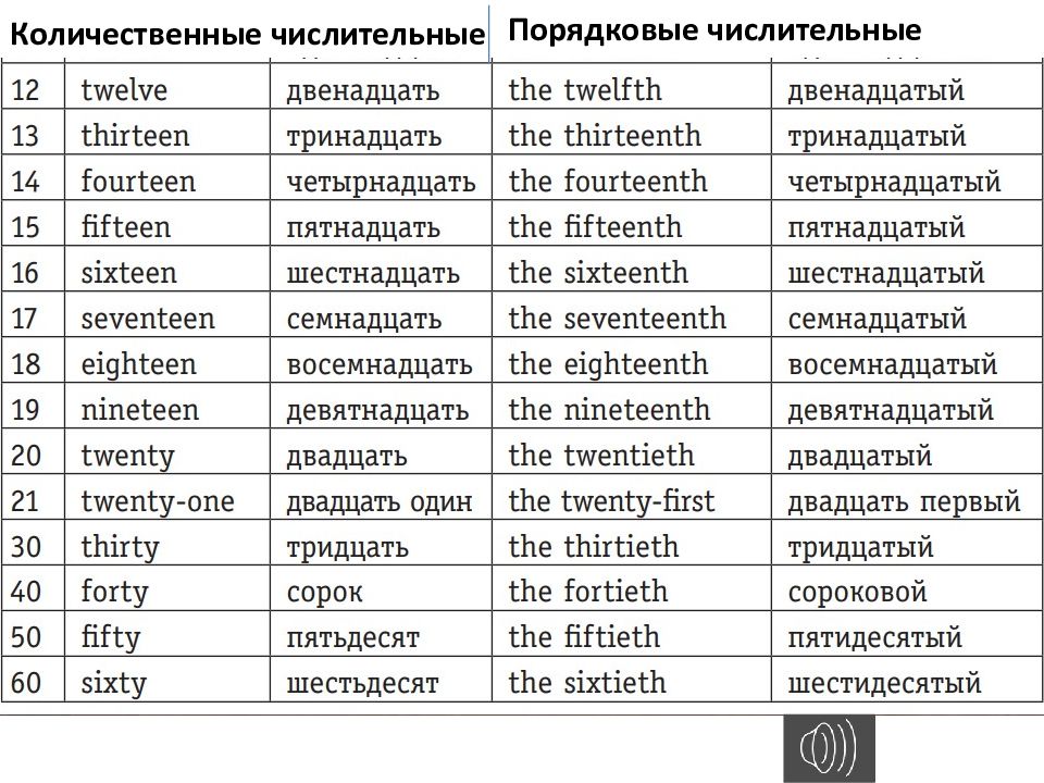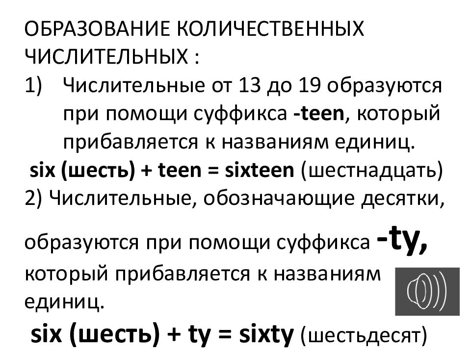 ОБРАЗОВАНИЕ КОЛИЧЕСТВЕННЫХ ЧИСЛИТЕЛЬНЫХ : Числительные от 13 до 19 образуются при помощи суффикса - teen, который прибавляется к названиям единиц. six (шесть) + teen = sixteen (шестнадцать) 2) Числительные, обозначающие десятки, образуются при помощи суффикса - ty, который прибавляется к названиям единиц. six (шесть) + ty = sixty (шестьдесят)