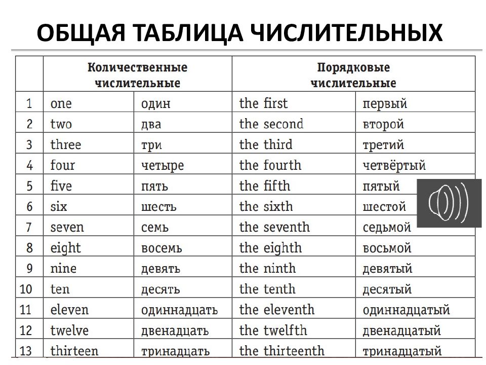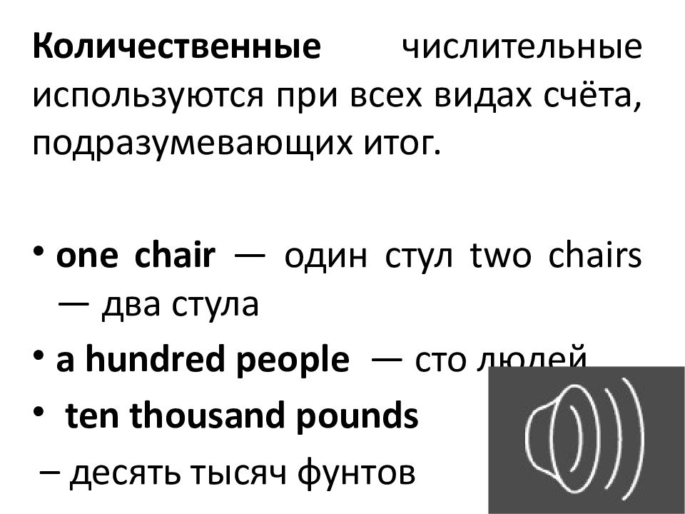 Количественные числительные используются при всех видах счёта, подразумевающих итог. one chair — один стул two chairs — два стула a hundred people — сто людей ten thousand pounds – десять тысяч фунтов