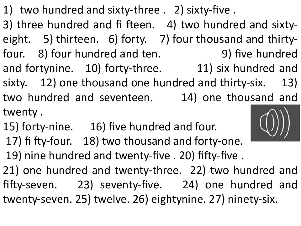 two hundred and sixty-three. 2) sixty-five. 3) three hundred and fi fteen. 4) two hundred and sixty-eight. 5) thirteen. 6) forty. 7) four thousand and thirty-four. 8) four hundred and ten. 9) five hundred and fortynine. 10) forty-three. 11) six hundred and sixty. 12) onе thousand one hundred and thirty-six. 13) two hundred and seventeen. 14) one thousand and twenty. 15) forty-nine. 16) five hundred and four. 17) fi fty -four. 18) two thousand and forty-one. 19) nine hundred and twenty-five. 20) fifty-five. 21) one hundred and twenty-three. 22) two hundred and fifty-seven. 23) seventy-five. 24) one hundred and twenty-seven. 25) twelve. 26) eightynine. 27) ninety-six.