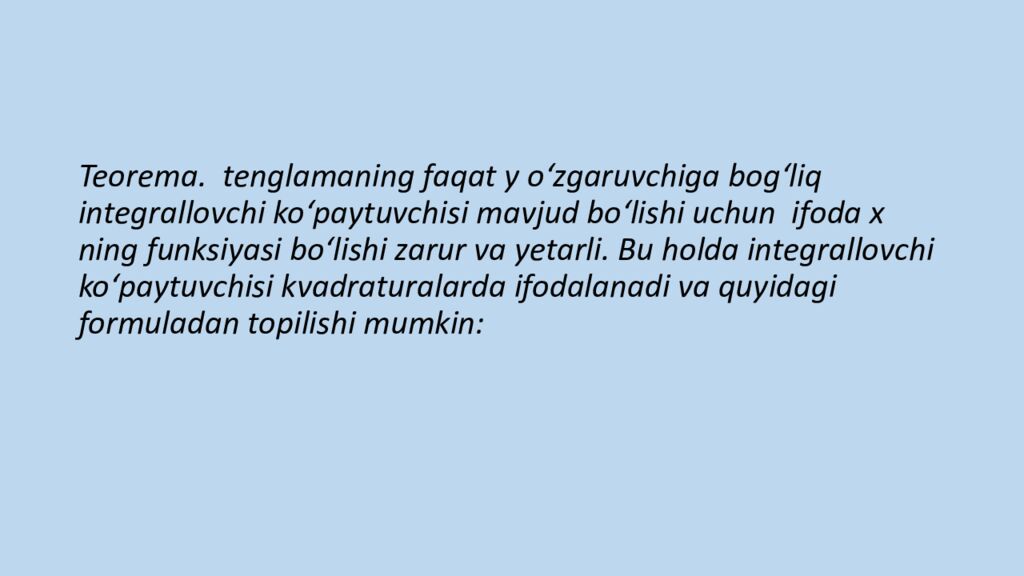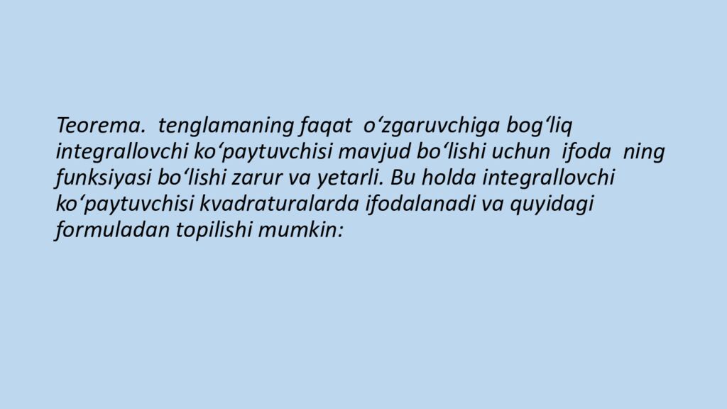 Teorema. tenglamaning faqat o‘zgaruvchiga bog‘liq integrallovchi ko‘paytuvchisi mavjud bo‘lishi uchun ifoda ning funksiyasi bo‘lishi zarur va yetarli. Bu holda integrallovchi ko‘paytuvchisi kvadraturalarda ifodalanadi va quyidagi formuladan topilishi mumkin :