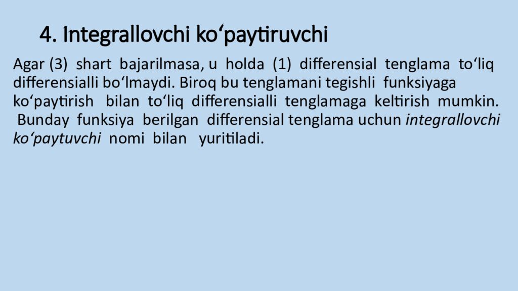 Agar (3) shart bajarilmasa, u holda (1) differensial tenglama to‘liq differensialli bo‘lmaydi. Biro q bu tenglamani tegishli funksiyaga ko‘paytirish bilan to‘li q differensialli tenglamaga keltirish mumkin. Bunday funksiya berilgan differensial tenglama uchun integrallovchi ko‘paytuvchi nomi bilan yuritiladi.