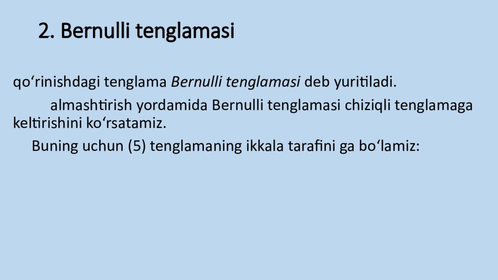 qo‘rinishdagi tenglama Bernulli tenglamasi deb yuritiladi. almashtirish yordamida Bernulli tenglamasi chiziqli tenglamaga keltirishini ko‘rsatamiz. Buning uchun (5) tenglamaning ikkala tarafini ga bo‘lamiz :
