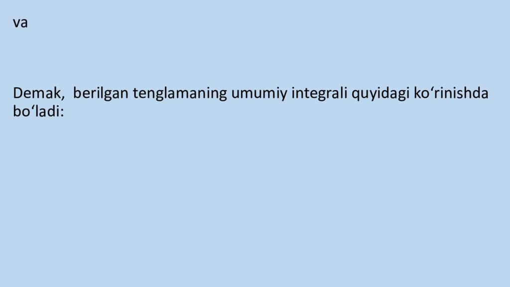 va Demak, berilgan tenglamaning umumiy integrali quyidagi ko‘rinishda bo‘ladi :