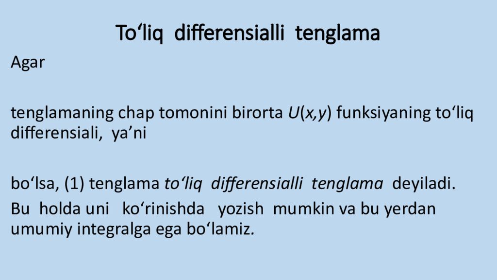 Последний слайд презентации: Chiziqli differensial tenglama. Toliq differensialli tenglama