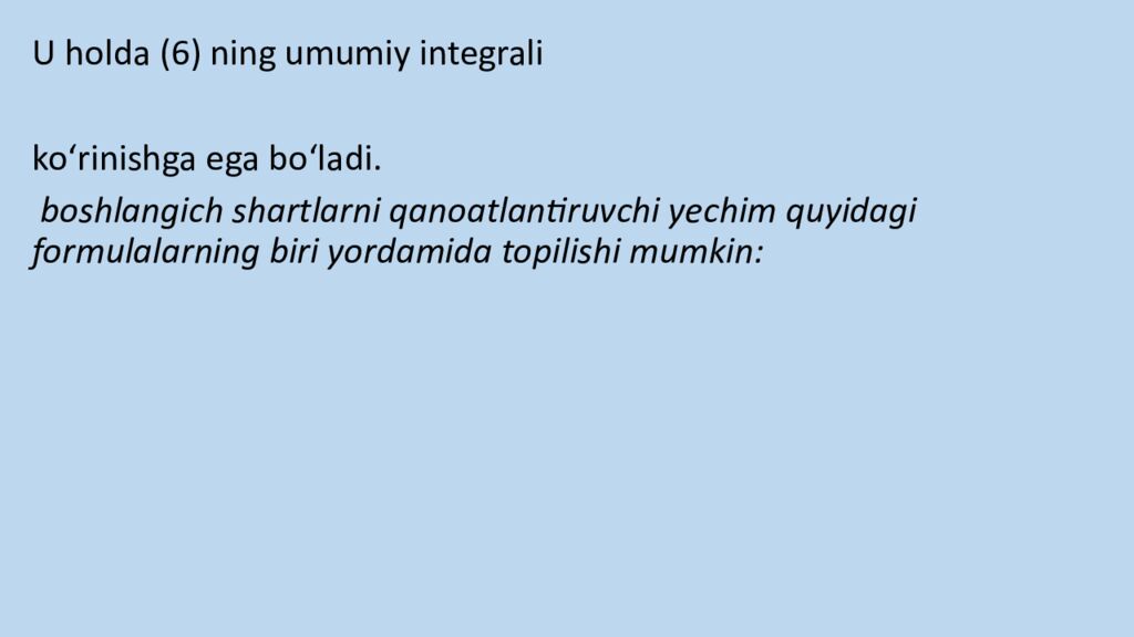 U holda (6) ning umumiy integrali ko‘rinishga ega bo‘ladi. boshlangich shartlarni qanoatlantiruvchi yechim quyidagi formulalarning biri yordamida topilishi mumkin :