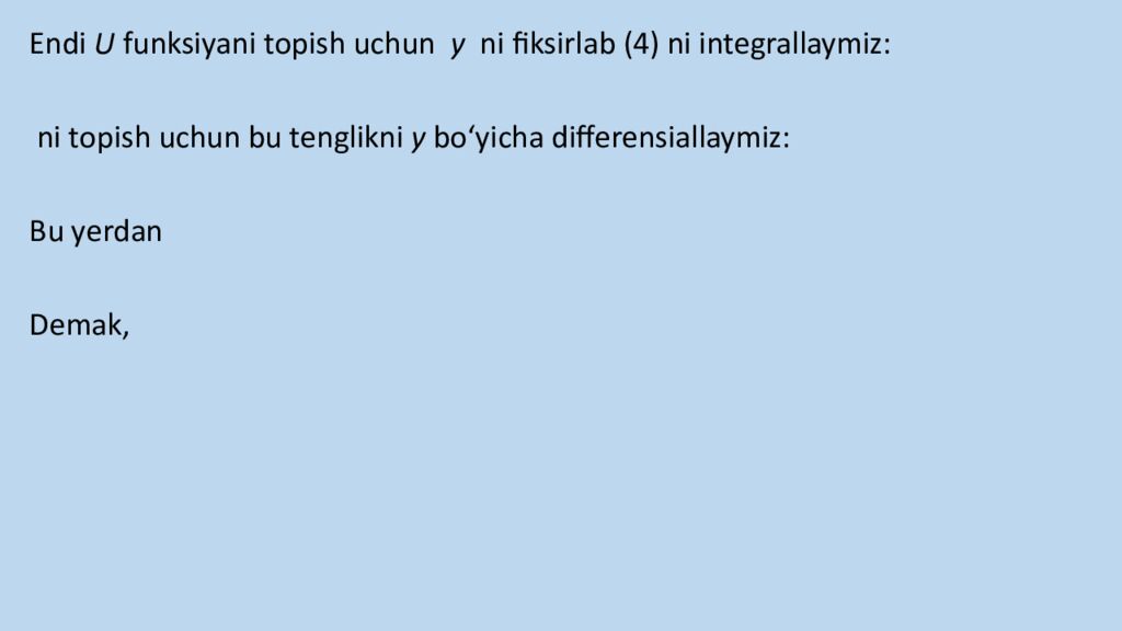 Endi U funksiyani topish uchun y ni fiksirlab (4) ni integrallaymiz : ni topish uchun bu tenglikni у bo‘yicha differensiallaymiz : Bu yerdan Demak,
