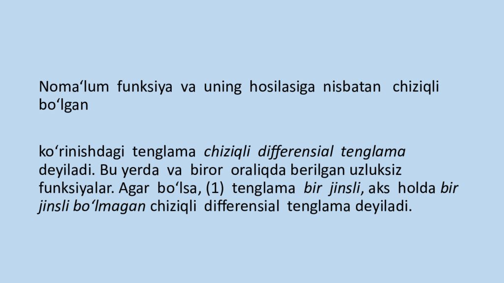 Noma‘lum funksiya va uning hosilasiga nisbatan chiziqli bo‘lgan ko‘rinishdagi tenglama chiziqli differensial tenglama deyiladi. Bu yerda va biror oraliqda berilgan uzluksiz funksiyalar. Agar bo‘lsa, (1) tenglama bir jinsli, aks holda bir jinsli bo‘lmagan chiziqli differensial tenglama deyiladi.