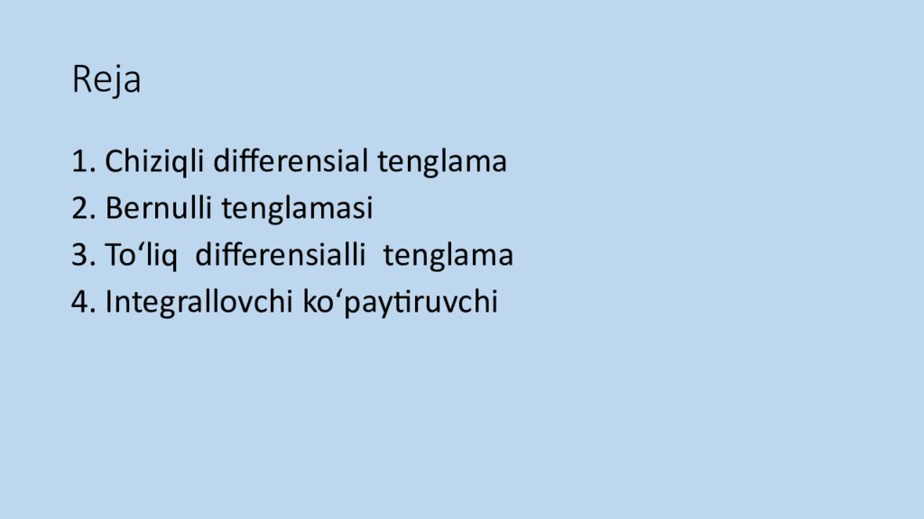 1. Chiziqli differensial tenglama 2. Bernulli tenglamasi 3. To‘liq differensialli tenglama 4. Integrallovchi ko‘paytiruvchi