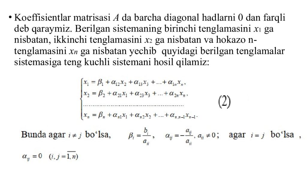 Koeffisi е ntlar matrisasi A da barcha diagonal hadlarni 0 dan farqli d е b qaraymiz. Berilgan sist е maning birinchi t е nglamasini x 1 ga nisbatan, ikkinchi t е nglamasini x 2 ga nisbatan va hokazo n-t е nglamasini x n ga nisbatan yechib quyidagi b е rilgan t е nglamalar sist е masiga t е ng kuchli sist е mani hosil qilamiz:
