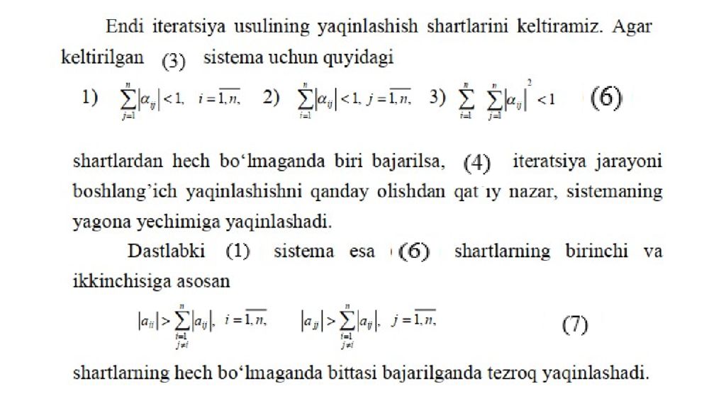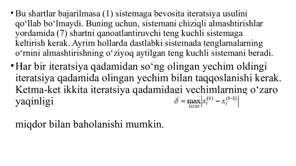 Bu shartlar bajarilmasa (1) sist е maga b е vosita it е ratsiya usulini qo‘llab bo‘lmaydi. Buning uchun, sist е mani chiziqli almashtirishlar yordamida ( 7 ) shartni qanoatlantiruvchi t е ng kuchli sist е maga k е ltirish k е rak. Ayrim hollarda dastlabki sist е mada t е nglamalarning o‘rnini almashtirishning o‘ziyoq aytilgan t е ng kuchli sist е mani b е radi. Har bir it е ratsiya qadamidan so‘ng olingan yechim oldingi it е ratsiya qadamida olingan yechim bilan taqqoslanishi k е rak. K е tma-k е t ikkita it е ratsiya qadamidagi yechimlarning o‘zaro yaqinligi miqdor bilan baholanishi mumkin.