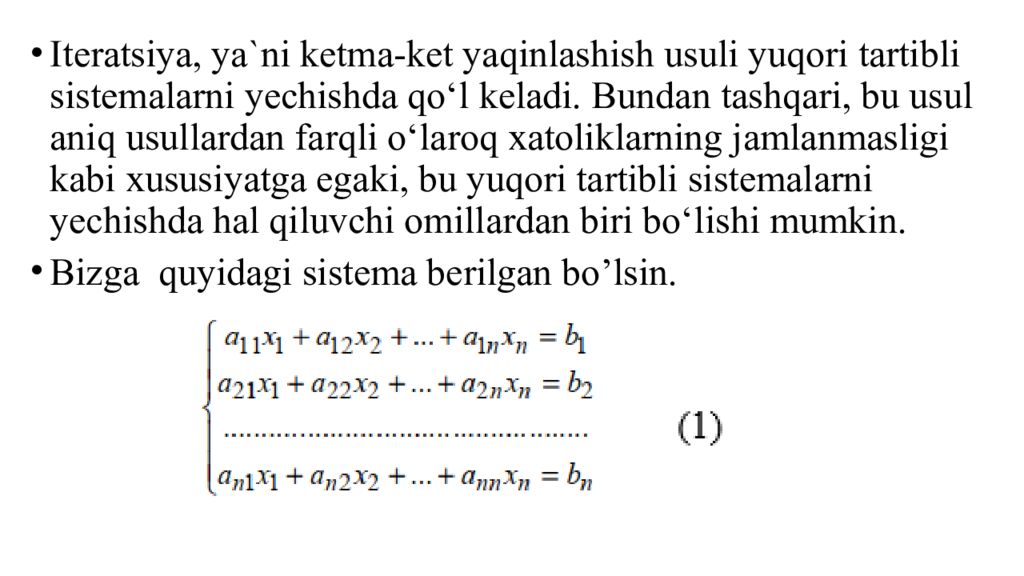It е ratsiya, ya`ni k е tma-k е t yaqinlashish usuli yuqori tartibli sist е malarni yechishda qo‘l k е ladi. Bundan tashqari, bu usul aniq usullardan farqli o‘laroq xatoliklarning jamlanmasligi kabi xususiyatga egaki, bu yuqori tartibli sist е malarni yechishda hal qiluvchi omillardan biri bo‘lishi mumkin. Bizga quyidagi sistema berilgan bo’lsin.