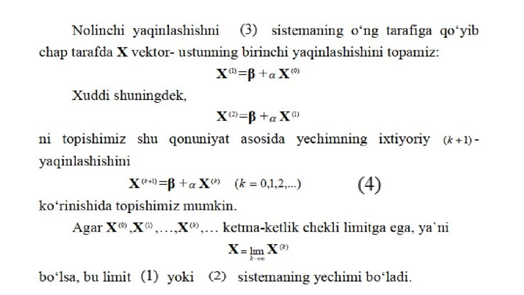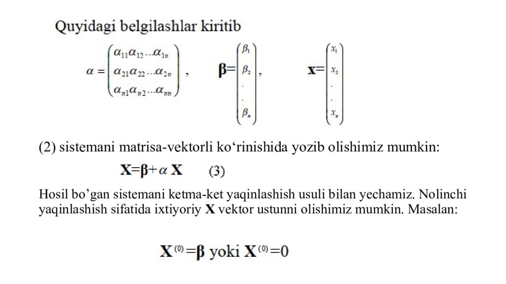 (2) sist е mani matrisa-v е ktorli ko‘rinishida yozib olishimiz mumkin: Hosil bo’gan sist е mani k е tma-k е t yaqinlashish usuli bilan yechamiz. Nolinchi yaqinlashish sifatida ixtiyoriy X v е ktor ustunni olishimiz mumkin. Masalan: