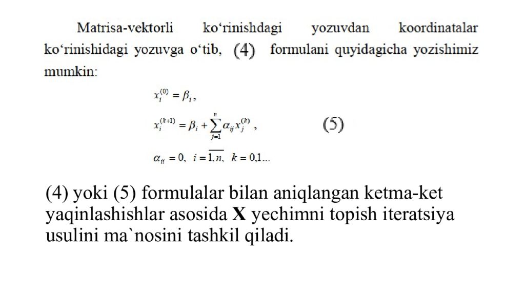 Слайд 6: ( 4 ) yoki ( 5 ) formulalar bilan aniqlangan k е tma-k е t yaqinlashishlar asosida X yechimni topish it е ratsiya usulini ma`nosini tashkil qiladi