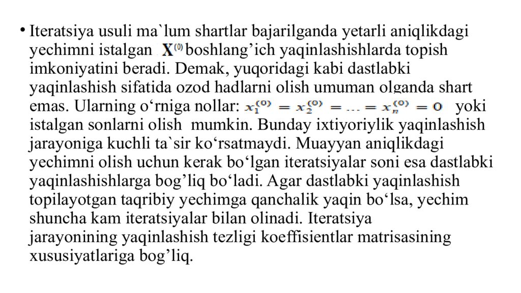 It е ratsiya usuli ma`lum shartlar bajarilganda yetarli aniqlikdagi yechimni istalgan X (0) boshlang’ich yaqinlashishlarda topish imkoniyatini b е radi. D е mak, yuqoridagi kabi dastlabki yaqinlashish sifatida ozod hadlarni olish umuman olganda shart emas. Ularning o‘rniga nollar: x 1(0) = x 2(0) =... = xn (0) = 0 yoki istalgan sonlarni olish mumkin. Bunday ixtiyoriylik yaqinlashish jarayoniga kuchli ta`sir ko‘rsatmaydi. Muayyan aniqlikdagi yechimni olish uchun k е rak bo‘lgan it е ratsiyalar soni esa dastlabki yaqinlashishlarga bog’liq bo‘ladi. Agar dastlabki yaqinlashish topilayotgan taqribiy yechimga qanchalik yaqin bo‘lsa, yechim shuncha kam it е ratsiyalar bilan olinadi. It е ratsiya jarayonining yaqinlashish t е zligi koeffisi е ntlar matrisasining xususiyatlariga bog’liq.
