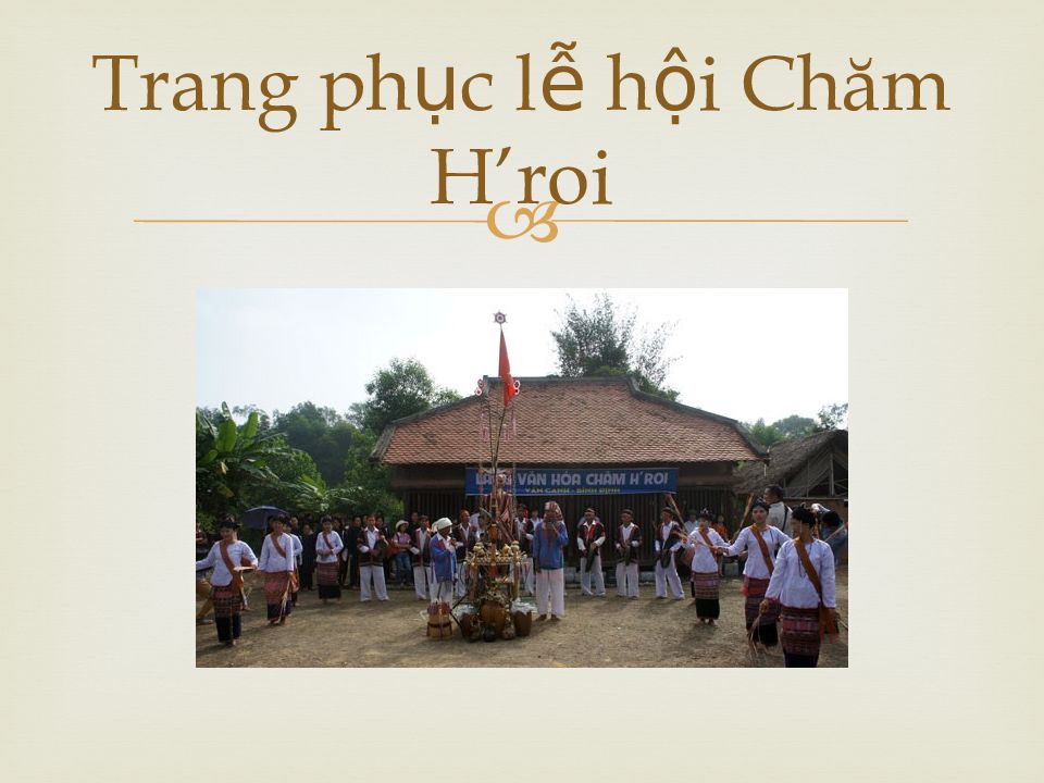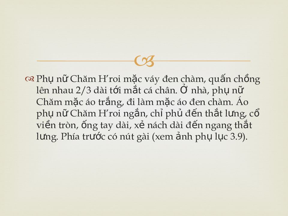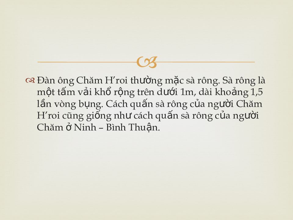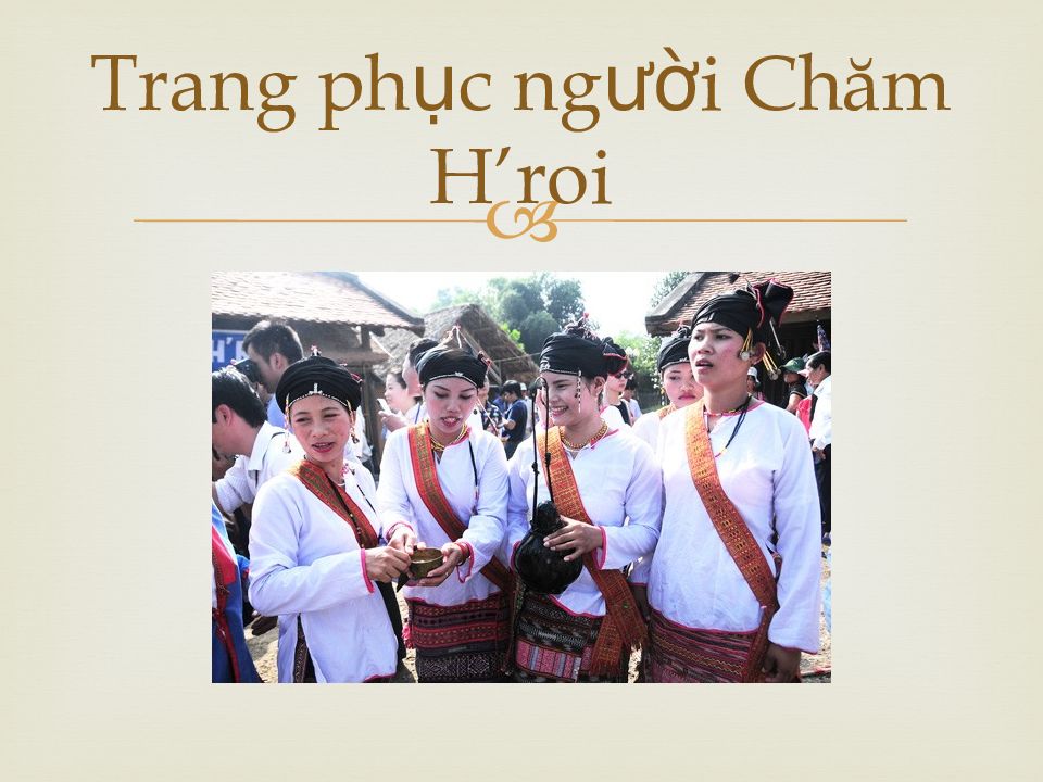 3.2.1. Trang phục của người Chăm ở Phú Yên, Bình Định Ngày xưa, người Chăm H’roi mặc trang phục như người Bana. Sản phẩm dệt của người Chăm H’roi có thể chia làm hai loại : Loại màu đen hay xanh đen chàm không có hoa văn dùng làm váy cho phụ nữ. Một loại dùng làm vải quấn như váy đàn ông hay làm chăn đắp gọi là khăn. Khăn thường có kích thước từ 60 đến 70cm. Khăn có thể trang trí hoa văn hoặc để nguyên. Khăn màu trắng còn dùng để may áo. 3.2. Trang phục
