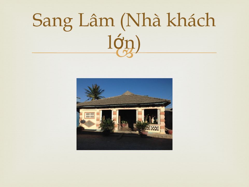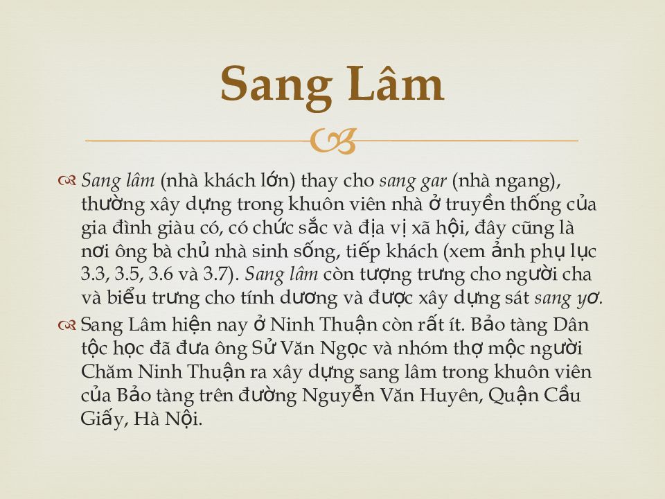 Sang lâm ( nhà khách lớn ) thay cho sang gar ( nhà ngang ), thường xây dựng trong khuôn viên nhà ở truyền thống của gia đình giàu có, có chức sắc và địa vị xã hội, đây cũng là nơi ông bà chủ nhà sinh sống, tiếp khách (xem ảnh phụ lục 3.3, 3.5, 3.6 và 3.7). Sang lâm còn tượng trưng cho người cha và biểu trưng cho tính dương và được xây dựng sát sang yơ. Sang Lâm hiện nay ở Ninh Thuận còn rất ít. Bảo tàng Dân tộc học đã đưa ông Sử Văn Ngọc và nhóm thợ mộc người Chăm Ninh Thuận ra xây dựng sang lâm trong khuôn viên của Bảo tàng trên đường Nguyễn Văn Huyên, Quận Cầu Giấy, Hà Nội. Sang Lâm
