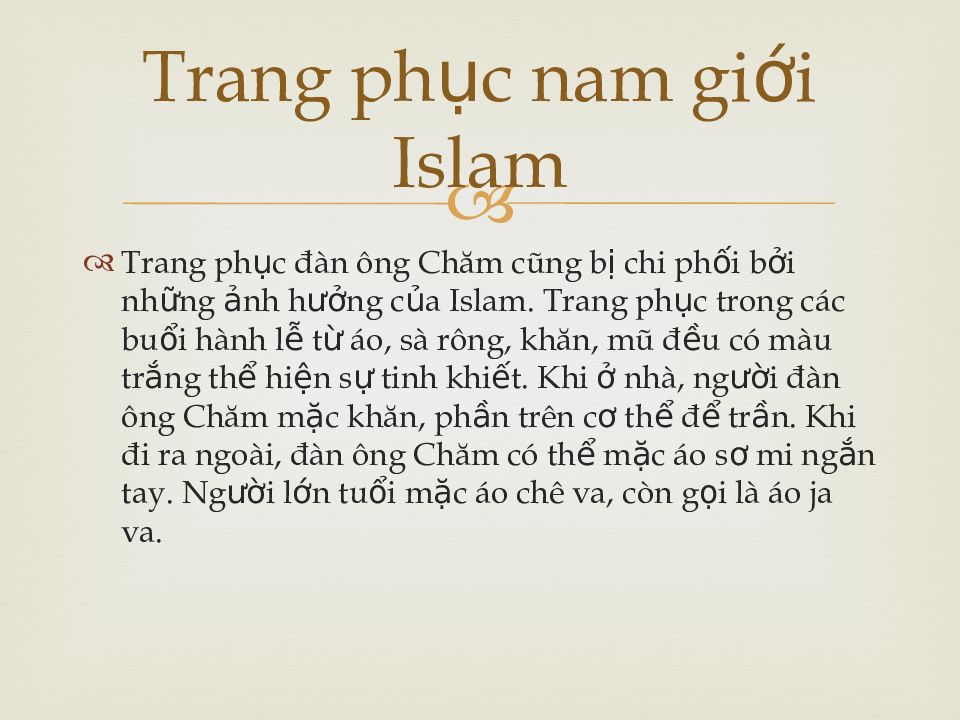 Trang phục đàn ông Chăm cũng bị chi phối bởi những ảnh hưởng của Islam. Trang phục trong các buổi hành lễ từ áo, sà rông, khăn, mũ đều có màu trắng thể hiện sự tinh khiết. Khi ở nhà, người đàn ông Chăm mặc khăn, phần trên cơ thể để trần. Khi đi ra ngoài, đàn ông Chăm có thể mặc áo sơ mi ngắn tay. Người lớn tuổi mặc áo chê va, còn gọi là áo ja va. Trang phục nam giới Islam