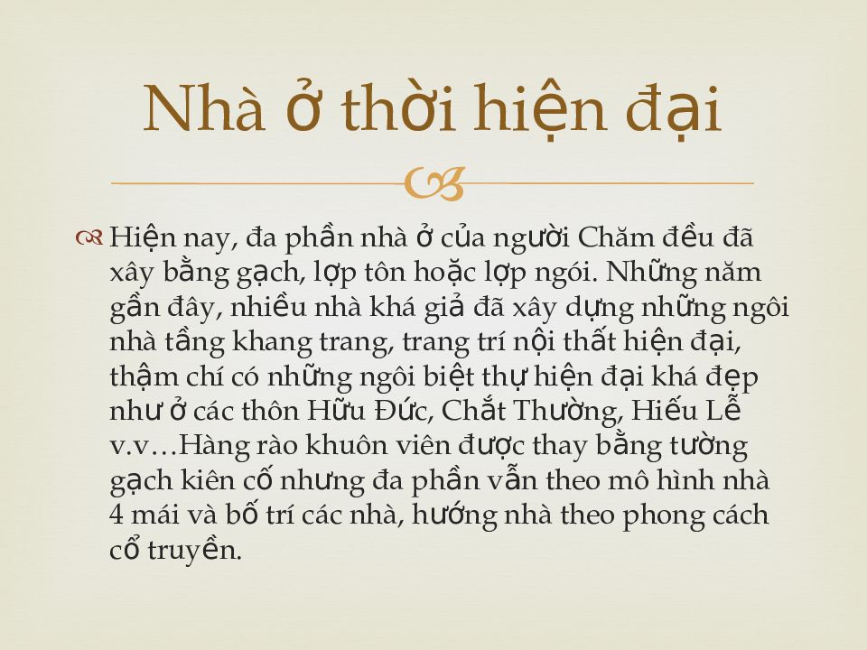 Hiện nay, đa phần nhà ở của người Chăm đều đã xây bằng gạch, lợp tôn hoặc lợp ngói. Những năm gần đây, nhiều nhà khá giả đã xây dựng những ngôi nhà tầng khang trang, trang trí nội thất hiện đại, thậm chí có những ngôi biệt thự hiện đại khá đẹp như ở các thôn Hữu Đức, Chắt Thường, Hiếu Lễ v.v … Hàng rào khuôn viên được thay bằng tường gạch kiên cố nhưng đa phần vẫn theo mô hình nhà 4 mái và bố trí các nhà, hướng nhà theo phong cách cổ truyền. Nhà ở thời hiện đại