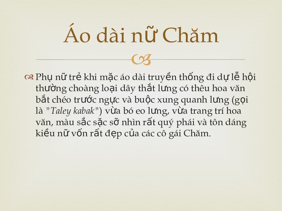 Phụ nữ trẻ khi mặc áo dài truyền thống đi dự lễ hội thường choàng loại dây thắt lưng có thêu hoa văn bắt chéo trước ngực và buộc xung quanh lưng ( gọi là " Taley kabak " ) vừa bó eo lưng, vừa trang trí hoa văn, màu sắc sặc sỡ nhìn rất quý phái và tôn dáng kiều nữ vốn rất đẹp của các cô gái Chăm. Áo dài nữ Chăm