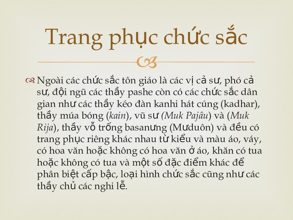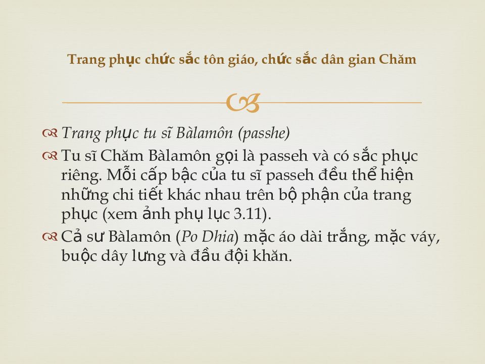 Trang phục tu sĩ Bàlamôn ( passhe ) Tu sĩ Chăm Bàlamôn gọi là passeh và có sắc phục riêng. Mỗi cấp bậc của tu sĩ passeh đều thể hiện những chi tiết khác nhau trên bộ phận của trang phục (xem ảnh phụ lục 3.11). Cả sư Bàlamôn ( Po Dhia ) mặc áo dài trắng, mặc váy, buộc dây lưng và đầu đội khăn. Trang phục chức sắc tôn giáo, chức sắc dân gian Chăm