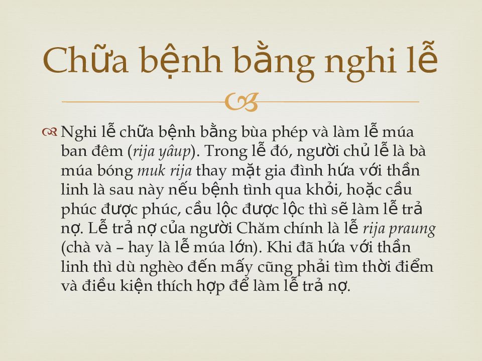 Nghi lễ chữa bệnh bằng bùa phép và làm lễ múa ban đêm ( rija yâup ). Trong lễ đó, người chủ lễ là bà múa bóng muk rija thay mặt gia đình hứa với thần linh là sau này nếu bệnh tình qua khỏi, hoặc cầu phúc được phúc, cầu lộc được lộc thì sẽ làm lễ trả nợ. Lễ trả nợ của người Chăm chính là lễ rija praung (chà và – hay là lễ múa lớn). Khi đã hứa với thần linh thì dù nghèo đến mấy cũng phải tìm thời điểm và điều kiện thích hợp để làm lễ trả nợ. Chữa bệnh bằng nghi lễ