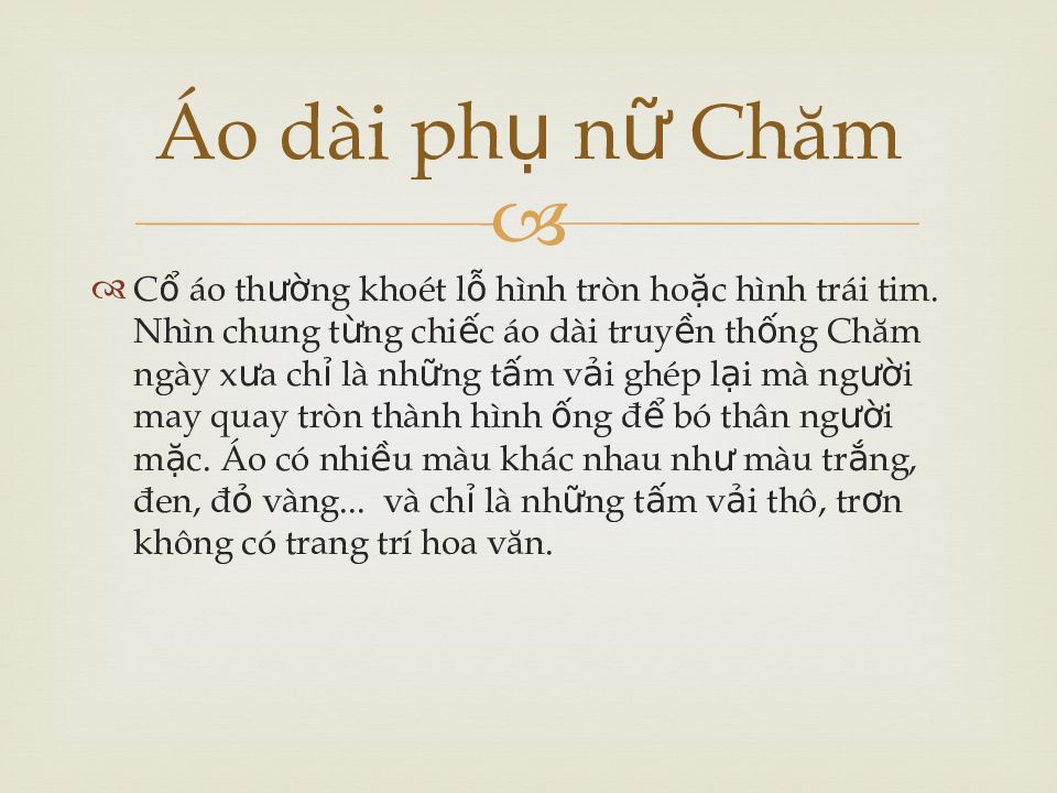 Cổ áo thường khoét lỗ hình tròn hoặc hình trái tim. Nhìn chung từng chiếc áo dài truyền thống Chăm ngày xưa chỉ là những tấm vải ghép lại mà người may quay tròn thành hình ống để bó thân người mặc. Áo có nhiều màu khác nhau như màu trắng, đen, đỏ vàng... và chỉ là những tấm vải thô, trơn không có trang trí hoa văn. Áo dài phụ nữ Chăm