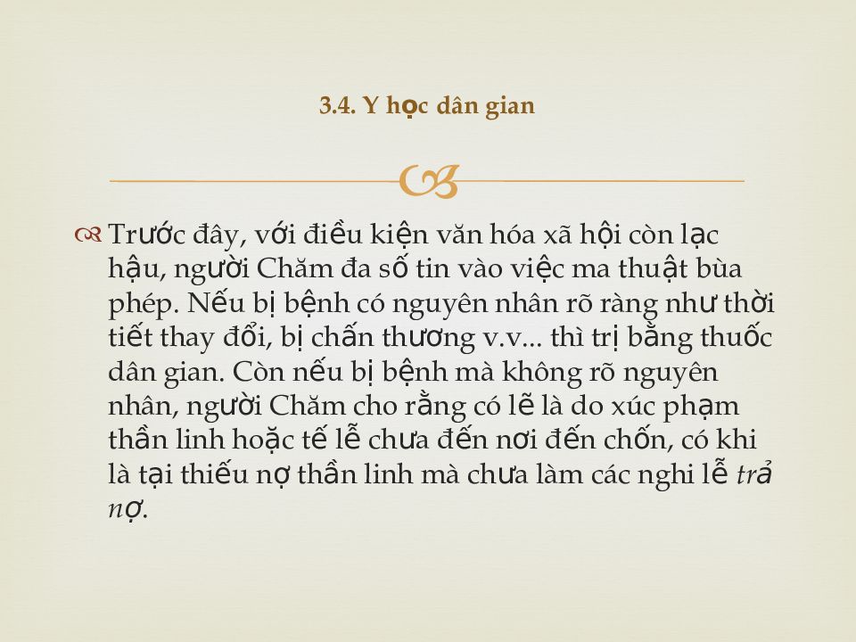 Trước đây, với điều kiện văn hóa xã hội còn lạc hậu, người Chăm đa số tin vào việc ma thuật bùa phép. Nếu bị bệnh có nguyên nhân rõ ràng như thời tiết thay đổi, bị chấn thương v.v... thì trị bằng thuốc dân gian. Còn nếu bị bệnh mà không rõ nguyên nhân, người Chăm cho rằng có lẽ là do xúc phạm thần linh hoặc tế lễ chưa đến nơi đến chốn, có khi là tại thiếu nợ thần linh mà chưa làm các nghi lễ trả nợ. 3.4. Y học dân gian