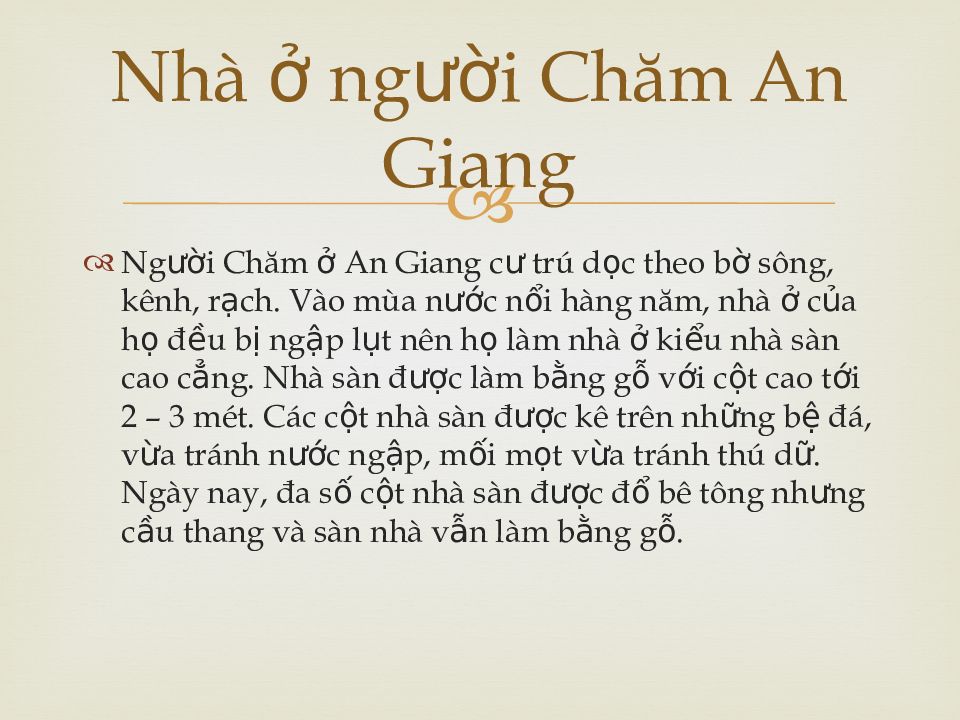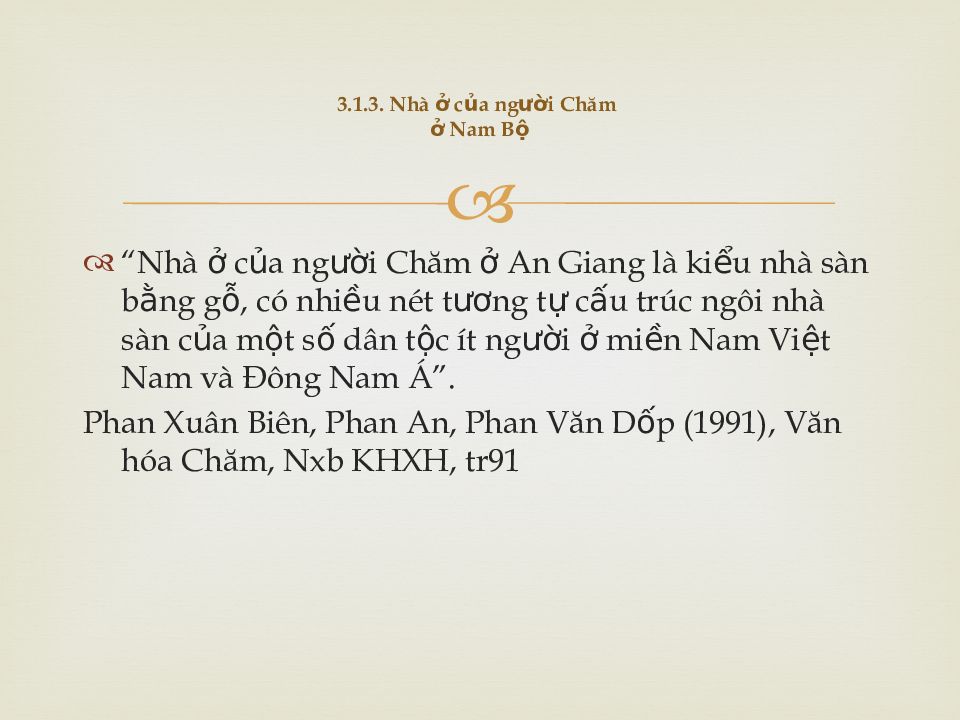 “ Nhà ở của người Chăm ở An Giang là kiểu nhà sàn bằng gỗ, có nhiều nét tương tự cấu trúc ngôi nhà sàn của một số dân tộc ít người ở miền Nam Việt Nam và Đông Nam Á”. Phan Xuân Biên, Phan An, Phan Văn Dốp (1991), Văn hóa Chăm, Nxb KHXH, tr91 3.1.3. Nhà ở của người Chăm ở Nam Bộ