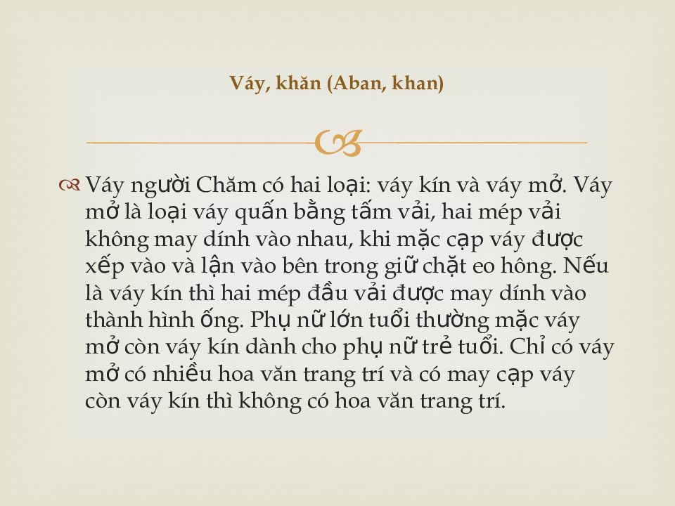 Váy người Chăm có hai loại : váy kín và váy mở. Váy mở là loại váy quấn bằng tấm vải, hai mép vải không may dính vào nhau, khi mặc cạp váy được xếp vào và lận vào bên trong giữ chặt eo hông. Nếu là váy kín thì hai mép đầu vải được may dính vào thành hình ống. Phụ nữ lớn tuổi thường mặc váy mở còn váy kín dành cho phụ nữ trẻ tuổi. Chỉ có váy mở có nhiều hoa văn trang trí và có may cạp váy còn váy kín thì không có hoa văn trang trí. Váy, khăn ( Aban, khan)
