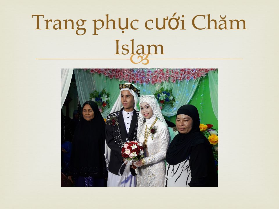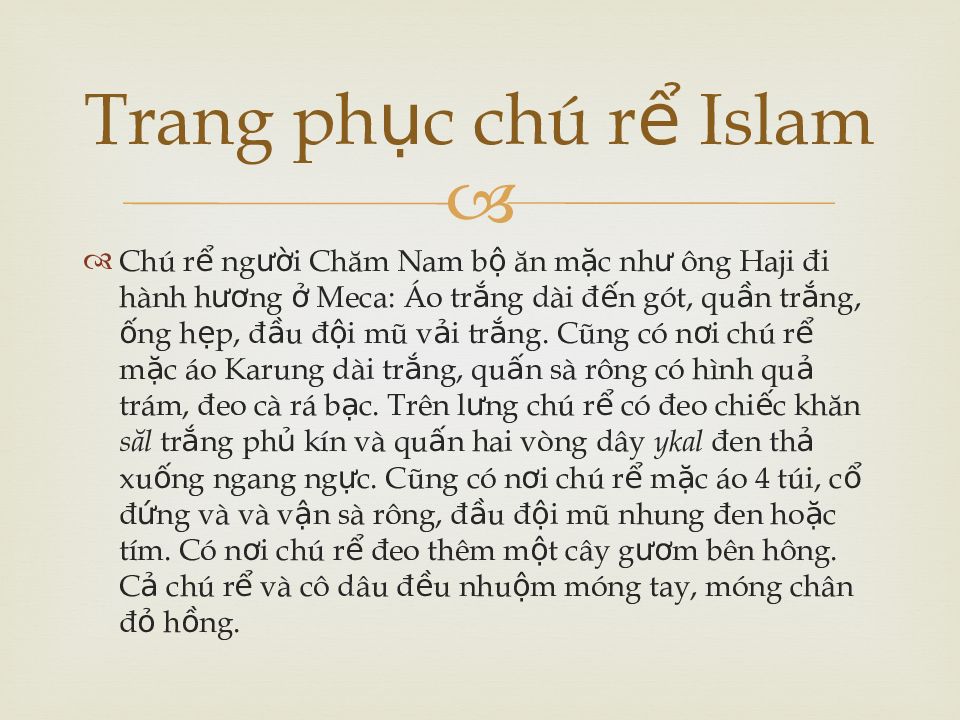 Chú rể người Chăm Nam bộ ăn mặc như ông Haji đi hành hương ở Meca : Áo trắng dài đến gót, quần trắng, ống hẹp, đầu đội mũ vải trắng. Cũng có nơi chú rể mặc áo Karung dài trắng, quấn sà rông có hình quả trám, đeo cà rá bạc. Trên lưng chú rể có đeo chiếc khăn s ă l trắng phủ kín và quấn hai vòng dây yka l đen thả xuống ngang ngực. Cũng có nơi chú rể mặc áo 4 túi, cổ đứng và và vận sà rông, đầu đội mũ nhung đen hoặc tím. Có nơi chú rể đeo thêm một cây gươm bên hông. Cả chú rể và cô dâu đều nhuộm móng tay, móng chân đỏ hồng. Trang phục chú rể Islam