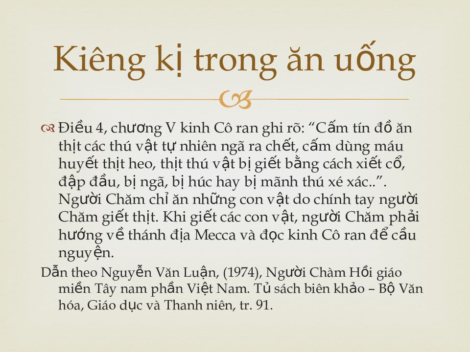 Điều 4, chương V kinh Cô ran ghi rõ: “Cấm tín đồ ăn thịt các thú vật tự nhiên ngã ra chết, cấm dùng máu huyết thịt heo, thịt thú vật bị giết bằng cách xiết cổ, đập đầu, bị ngã, bị húc hay bị mãnh thú xé xác..”. Người Chăm chỉ ăn những con vật do chính tay người Chăm giết thịt. Khi giết các con vật, người Chăm phải hướng về thánh địa Mecca và đọc kinh Cô ran để cầu nguyện. Dẫn theo Nguyễn Văn Luận, (1974), Người Chàm Hồi giáo miền Tây nam phần Việt Nam. Tủ sách biên khảo – Bộ Văn hóa, Giáo dục và Thanh niên, tr. 91. Kiêng kị trong ăn uống