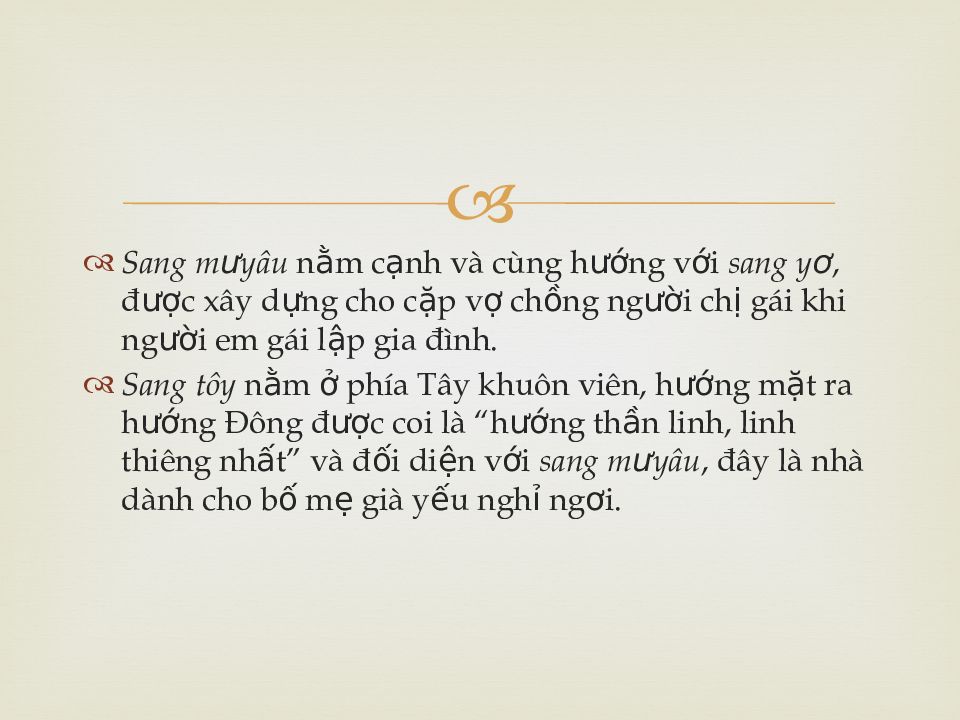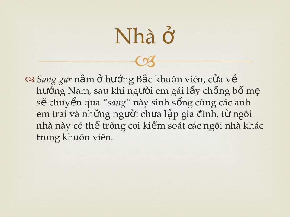 Sang gar nằm ở hướng Bắc khuôn viên, cửa về hướng Nam, sau khi người em gái lấy chồng bố mẹ sẽ chuyển qua “sang” này sinh sống cùng các anh em trai và những người chưa lập gia đình, từ ngôi nhà này có thể trông coi kiểm soát các ngôi nhà khác trong khuôn viên. Nhà ở
