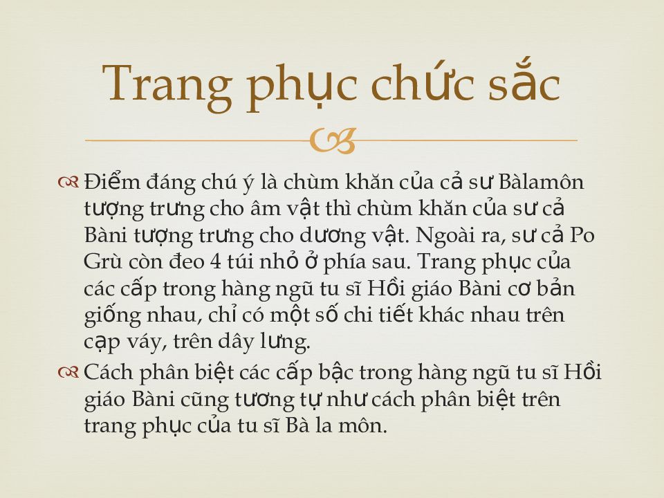 Điểm đáng chú ý là chùm khăn của cả sư Bàlamôn tượng trưng cho âm vật thì chùm khăn của sư cả Bàni tượng trưng cho dương vật. Ngoài ra, sư cả Po Grù còn đeo 4 túi nhỏ ở phía sau. Trang phục của các cấp trong hàng ngũ tu sĩ Hồi giáo Bàni cơ bản giống nhau, chỉ có một số chi tiết khác nhau trên cạp váy, trên dây lưng. Cách phân biệt các cấp bậc trong hàng ngũ tu sĩ Hồi giáo Bàni cũng tương tự như cách phân biệt trên trang phục của tu sĩ Bà la môn. Trang phục chức sắc