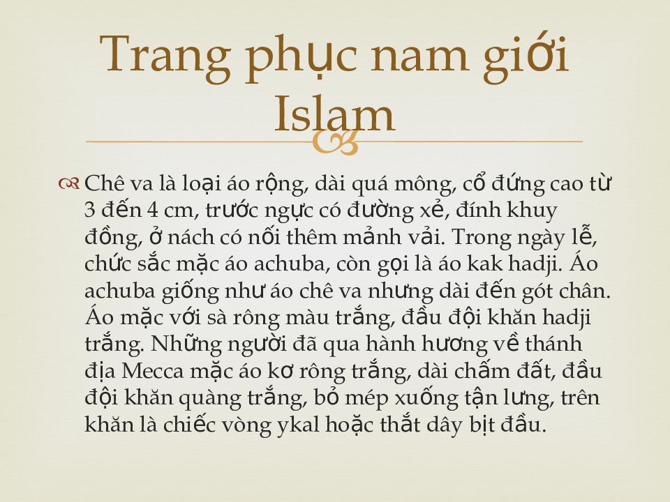 Chê va là loại áo rộng, dài quá mông, cổ đứng cao từ 3 đến 4 cm, trước ngực có đường xẻ, đính khuy đồng, ở nách có nối thêm mảnh vải. Trong ngày lễ, chức sắc mặc áo achuba, còn gọi là áo kak hadji. Áo achuba giống như áo chê va nhưng dài đến gót chân. Áo mặc với sà rông màu trắng, đầu đội khăn hadji trắng. Những người đã qua hành hương về thánh địa Mecca mặc áo kơ rông trắng, dài chấm đất, đầu đội khăn quàng trắng, bỏ mép xuống tận lưng, trên khăn là chiếc vòng ykal hoặc thắt dây bịt đầu. Trang phục nam giới Islam