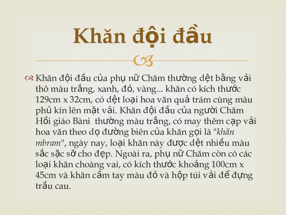 của phụ nữ Chăm thường dệt bằng vải thô màu trắng, xanh, đỏ, vàng... khăn có kích thước 129cm x 32cm, có dệt loại hoa văn quả trám cùng màu phủ kín lên mặt vải. Khăn đội đầu của người Chăm Hồi giáo Bàni thường màu trắng, có may thêm cạp vải hoa văn theo dọ đường biên của khăn gọi là " khăn mbram ", ngày nay, loại khăn này được dệt nhiều màu sắc sặc sỡ cho đẹp. Ngoài ra, phụ nữ Chăm còn có các loại khăn choàng vai, có kích thước khoảng 100cm x 45cm và khăn cầm tay màu đỏ và hộp túi vải để đựng trầu cau. Khăn đội đầu