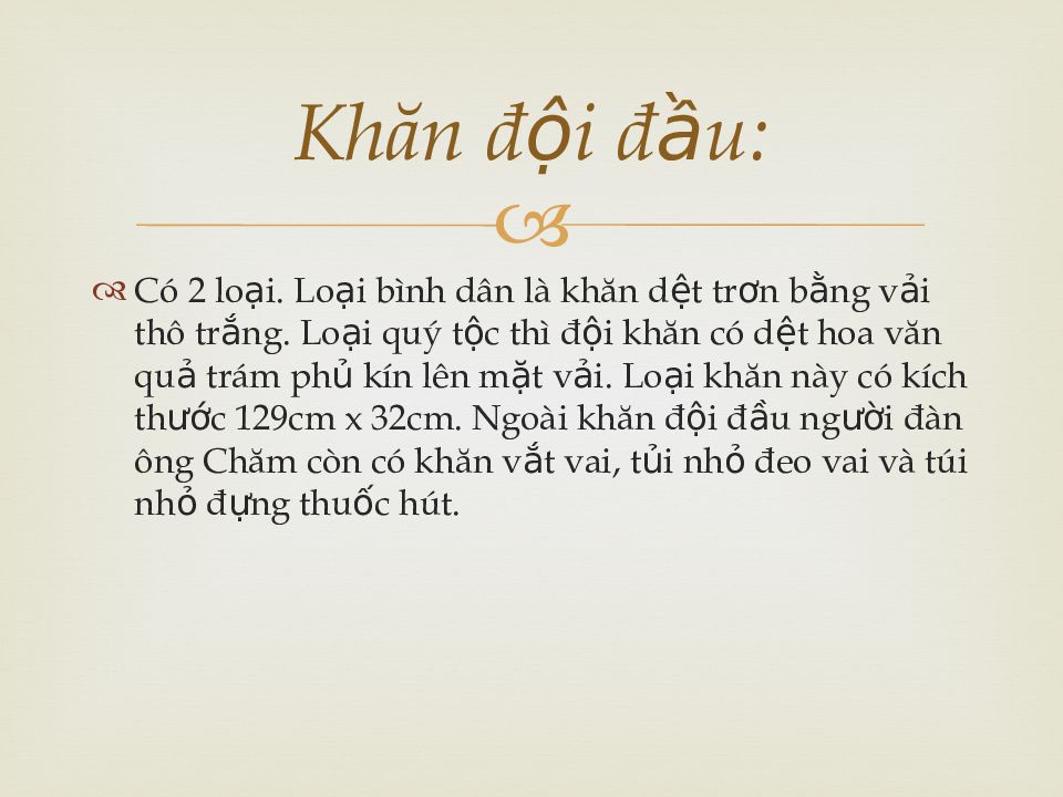 Có 2 loại. Loại bình dân là khăn dệt trơn bằng vải thô trắng. Loại quý tộc thì đội khăn có dệt hoa văn quả trám phủ kín lên mặt vải. Loại khăn này có kích thước 129cm x 32cm. Ngoài khăn đội đầu người đàn ông Chăm còn có khăn vắt vai, tủi nhỏ đeo vai và túi nhỏ đựng thuốc hút. Khăn đội đầu :