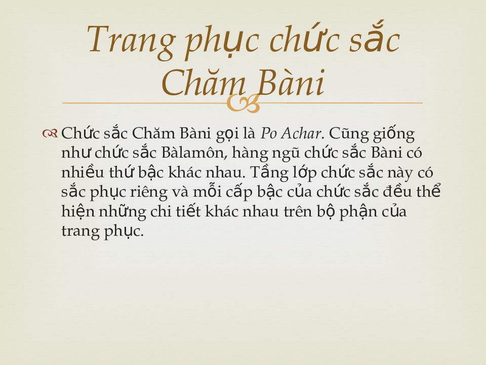 Chức sắc Chăm Bàni gọi là Po Achar. Cũng giống như chức sắc Bàlamôn, hàng ngũ chức sắc Bàni có nhiều thứ bậc khác nhau. Tầng lớp chức sắc này có sắc phục riêng và mỗi cấp bậc của chức sắc đều thể hiện những chi tiết khác nhau trên bộ phận của trang phục. Trang phục chức sắc Chăm Bàni
