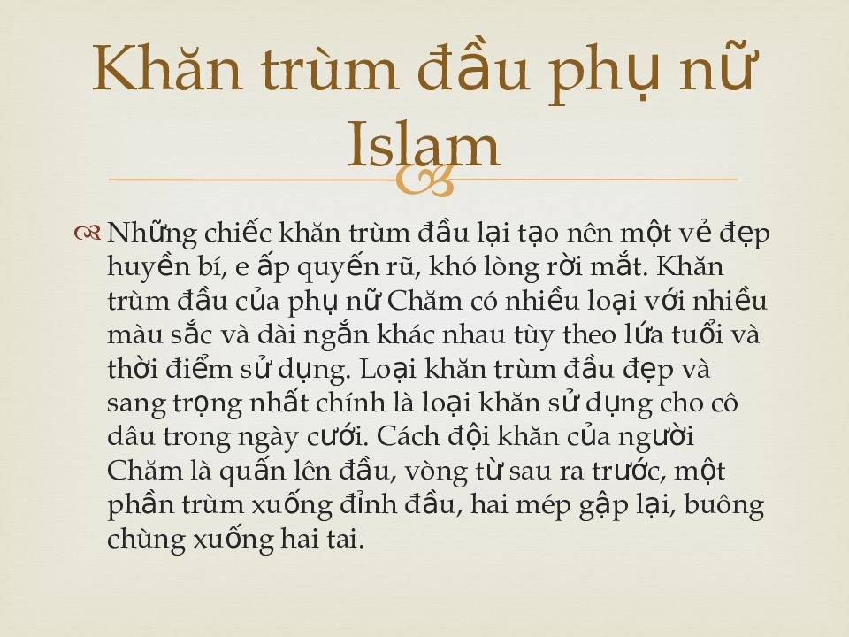 Những chiếc khăn trùm đầu lại tạo nên một vẻ đẹp huyền bí, e ấp quyến rũ, khó lòng rời mắt. Khăn trùm đầu của phụ nữ Chăm có nhiều loại với nhiều màu sắc và dài ngắn khác nhau tùy theo lứa tuổi và thời điểm sử dụng. Loại khăn trùm đầu đẹp và sang trọng nhất chính là loại khăn sử dụng cho cô dâu trong ngày cưới. Cách đội khăn của người Chăm là quấn lên đầu, vòng từ sau ra trước, một phần trùm xuống đỉnh đầu, hai mép gập lại, buông chùng xuống hai tai. Khăn trùm đầu phụ nữ Islam