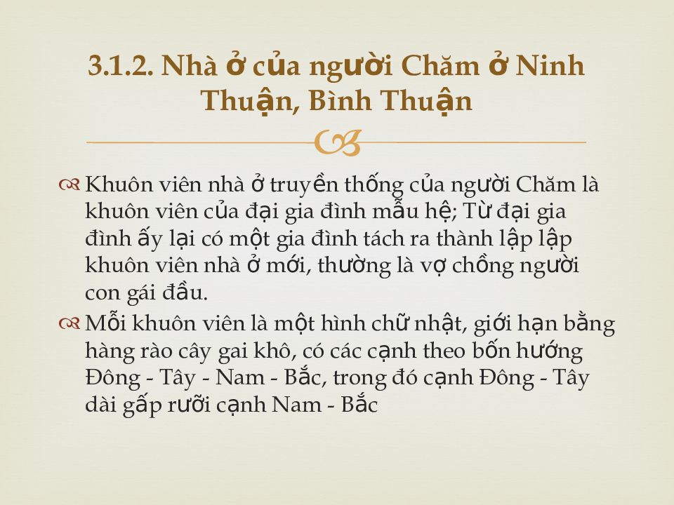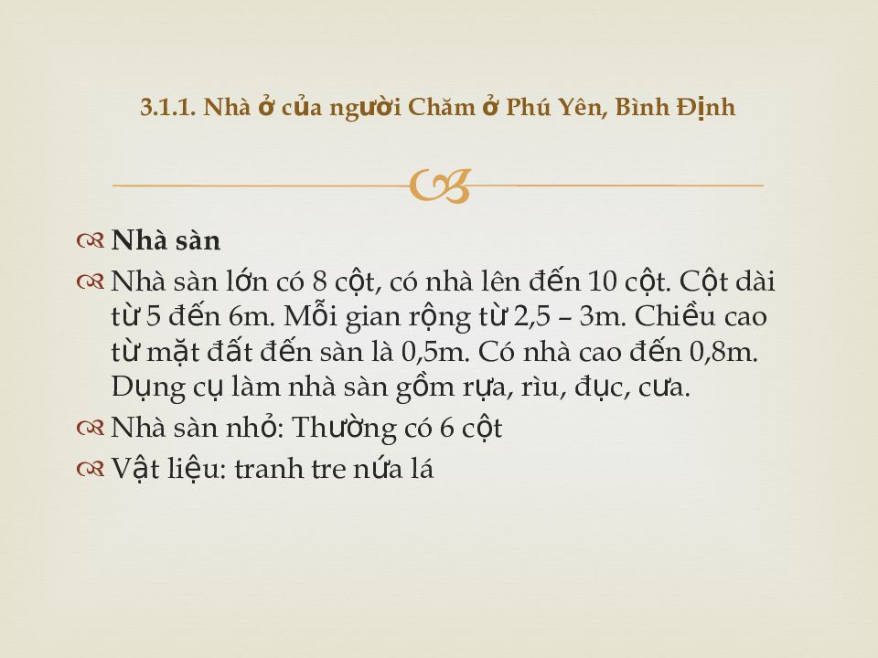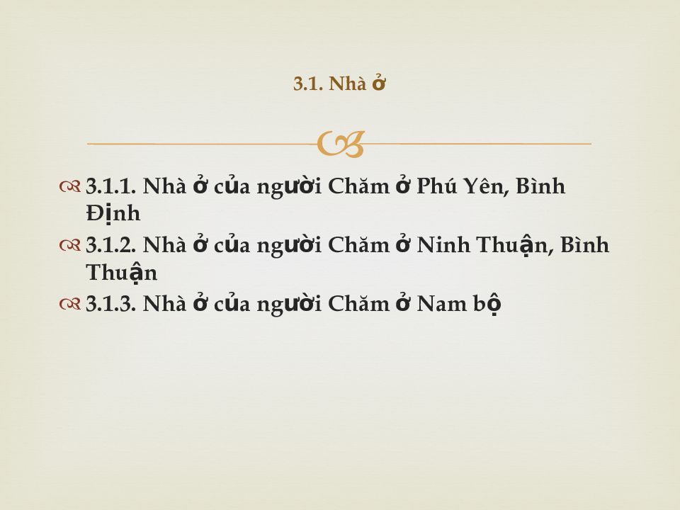 3.1.1. Nhà ở của người Chăm ở Phú Yên, Bình Định 3.1.2. Nhà ở của người Chăm ở Ninh Thuận, Bình Thuận 3.1.3. Nhà ở của người Chăm ở Nam bộ 3.1. Nhà ở
