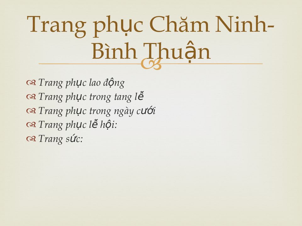 Trang phục lao động Trang phục trong tang lễ Trang phục trong ngày cưới Trang phục lễ hội : Trang sức: Trang phục Chăm Ninh - Bình Thuận