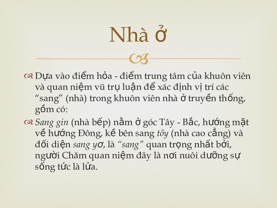 Dựa vào điểm hỏa - điểm trung tâm của khuôn viên và quan niệm vũ trụ luận để xác định vị trí các “sang” ( nhà ) trong khuôn viên nhà ở truyền thống, gồm có : Sang gin ( nhà bếp ) nằm ở góc Tây - Bắc, hướng mặt về hướng Đông, kề bên sang tôy ( nhà cao cẳng ) và đối diện sang yơ, là “sang” quan trọng nhất bởi, người Chăm quan niệm đây là nơi nuôi dưỡng sự sống tức là lửa. Nhà ở