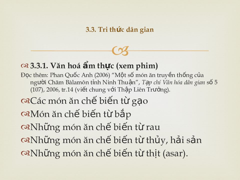 3.3.1. Văn hoá ẩm thực ( xem phim ) Đọc thêm : Phan Quốc Anh (2006) “ Một số món ăn truyền thống của người Chăm Bàlamôn tỉnh Ninh Thuận ”, Tạp chí Văn hóa dân gian số 5 (107), 2006, tr.14 ( viết chung với Thập Liên Trưởng ). Các món ăn chế biến từ gạo Món ăn chế biến từ bắp Những món ăn chế biến từ rau Những món ăn chế biến từ thủy, hải sản Những món ăn chế biến từ thịt ( asar ). 3.3. Tri thức dân gian