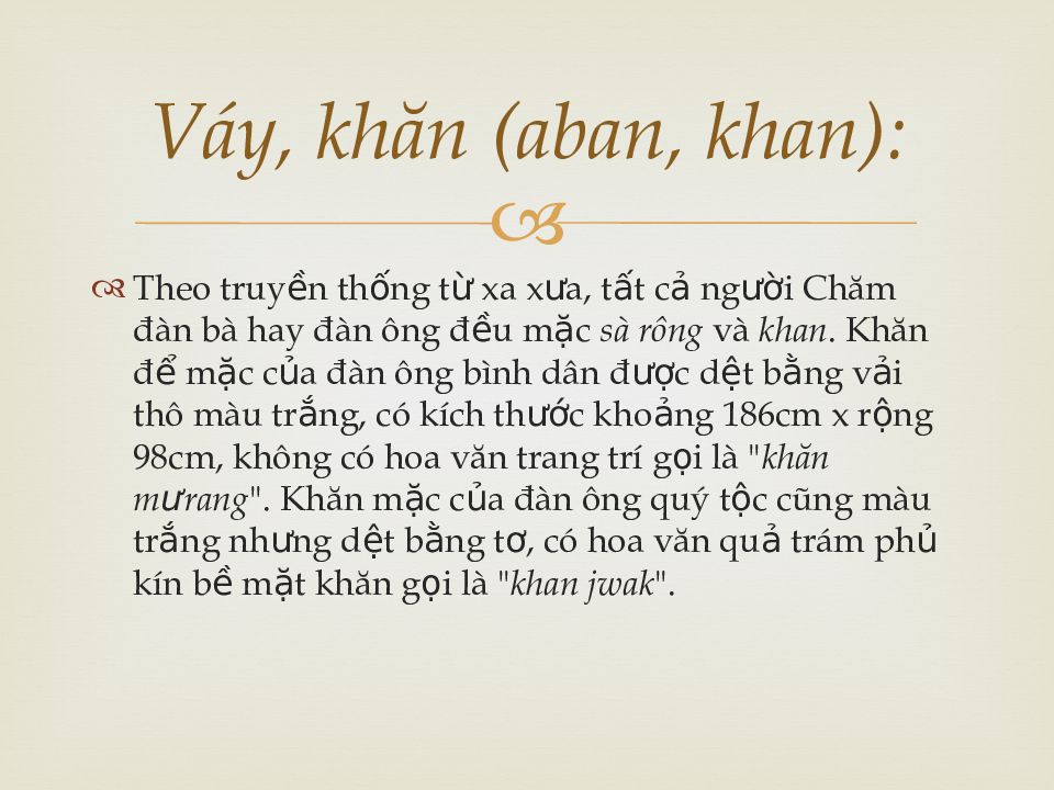 Theo truyền thống từ xa xưa, tất cả người Chăm đàn bà hay đàn ông đều mặc sà rông và khan. Khăn để mặc của đàn ông bình dân được dệt bằng vải thô màu trắng, có kích thước khoảng 186cm x rộng 98cm, không có hoa văn trang trí gọi là " khăn mưrang ". Khăn mặc của đàn ông quý tộc cũng màu trắng nhưng dệt bằng tơ, có hoa văn quả trám phủ kín bề mặt khăn gọi là " khan jwak ". Váy, khăn ( aban, khan):