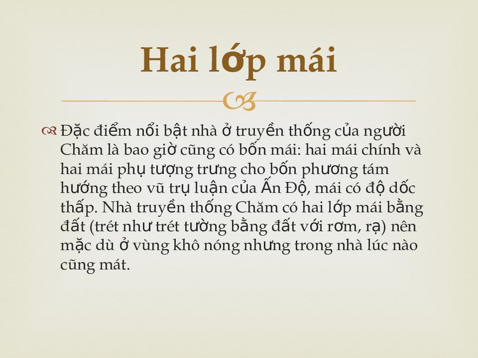 Đặc điểm nổi bật nhà ở truyền thống của người Chăm là bao giờ cũng có bốn mái : hai mái chính và hai mái phụ tượng trưng cho bốn phương tám hướng theo vũ trụ luận của Ấn Độ, mái có độ dốc thấp. Nhà truyền thống Chăm có hai lớp mái bằng đất (trét như trét tường bằng đất với rơm, rạ) nên mặc dù ở vùng khô nóng nhưng trong nhà lúc nào cũng mát. Hai lớp mái