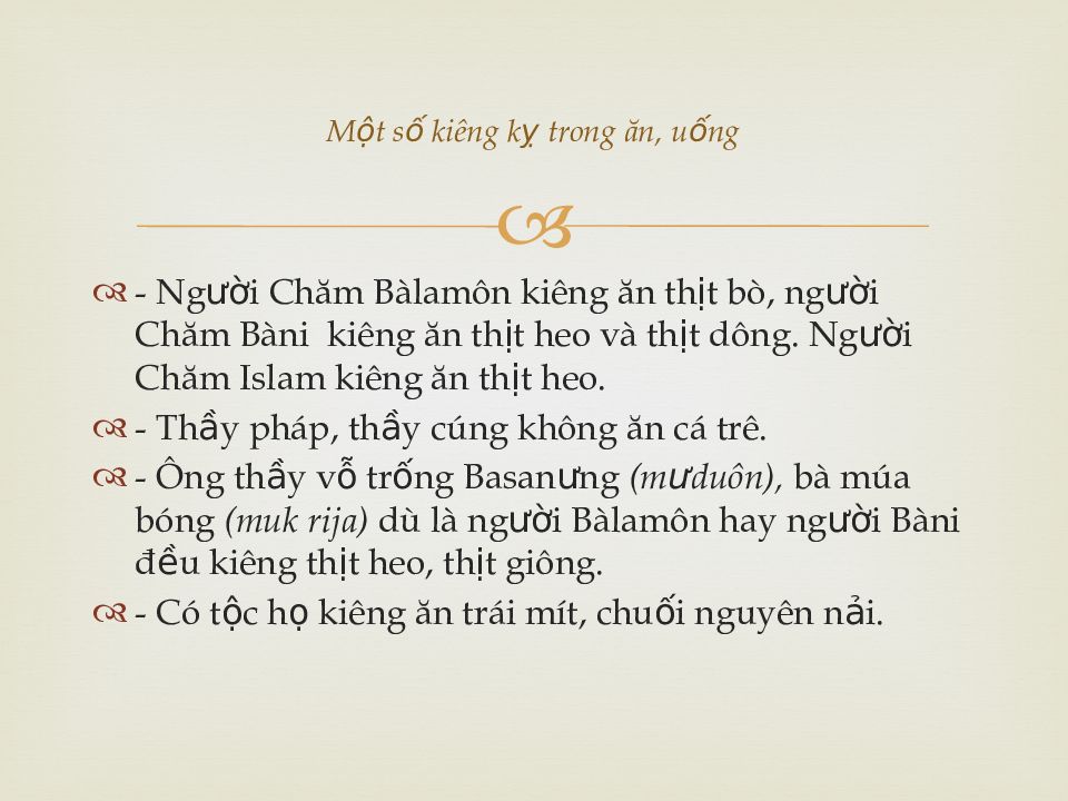 - Người Chăm Bàlamôn kiêng ăn thịt bò, người Chăm Bàni kiêng ăn thịt heo và thịt dông. Người Chăm Islam kiêng ăn thịt heo. - Thầy pháp, thầy cúng không ăn cá trê. - Ông thầy vỗ trống Basanưng ( mưduôn ), bà múa bóng ( muk rija ) dù là người Bàlamôn hay người Bàni đều kiêng thịt heo, thịt giông. - Có tộc họ kiêng ăn trái mít, chuối nguyên nải. Một số kiêng kỵ trong ăn, uống
