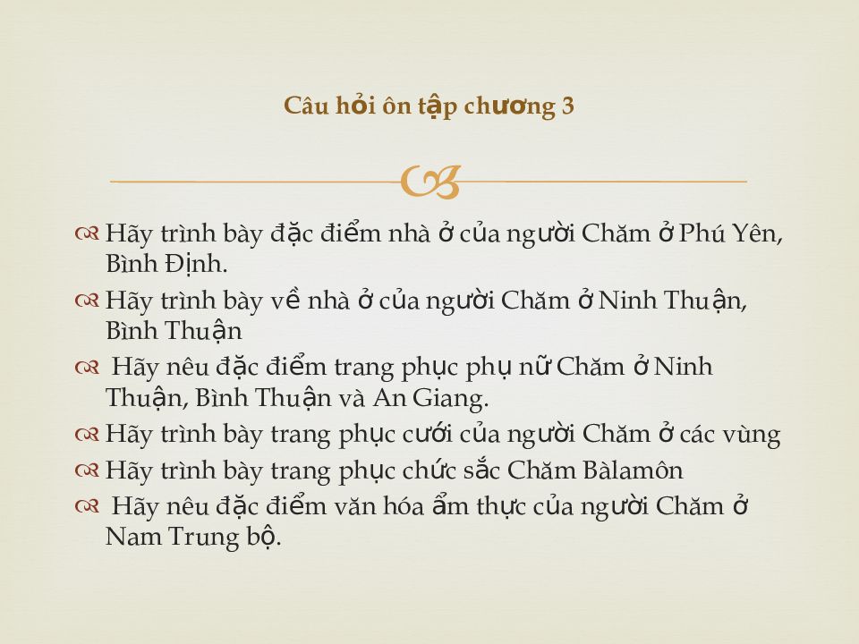 Hãy trình bày đặc điểm nhà ở của người Chăm ở Phú Yên, Bình Định. Hãy trình bày về nhà ở của người Chăm ở Ninh Thuận, Bình Thuận Hãy nêu đặc điểm trang phục phụ nữ Chăm ở Ninh Thuận, Bình Thuận và An Giang. Hãy trình bày trang phục cưới của người Chăm ở các vùng Hãy trình bày trang phục chức sắc Chăm Bàlamôn Hãy nêu đặc điểm văn hóa ẩm thực của người Chăm ở Nam Trung bộ. Câu hỏi ôn tập chương 3