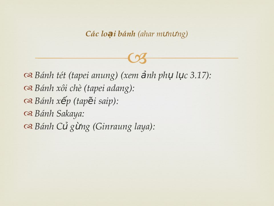 Bánh tét ( tapei anung ) (xem ảnh phụ lục 3.17) : Bánh xôi chè ( tapei adang ): Bánh xếp ( tapẽi saip ): Bánh Sakaya : Bánh Củ gừng ( Ginraung laya ): Các loại bánh ( ahar mưnưng )