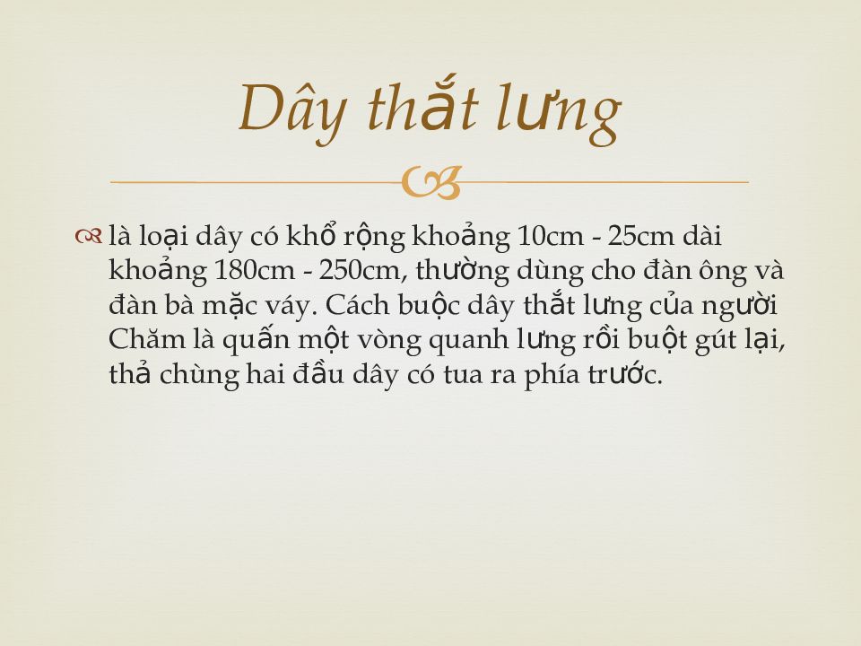 là loại dây có khổ rộng khoảng 10cm - 25cm dài khoảng 180cm - 250cm, thường dùng cho đàn ông và đàn bà mặc váy. Cách buộc dây thắt lưng của người Chăm là quấn một vòng quanh lưng rồi buột gút lại, thả chùng hai đầu dây có tua ra phía trước. Dây thắt lưng